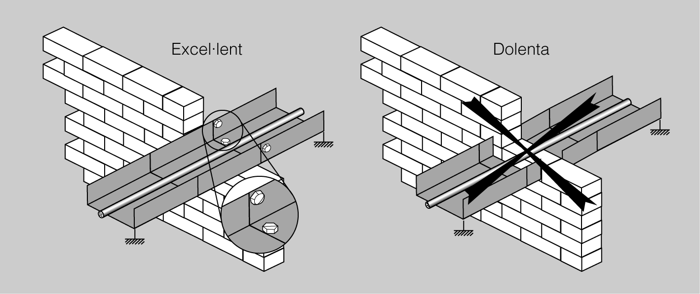 Els tubs es fixaran a les parets o sostres per mitjà de brides protegides contra la corrosió i sòlidament subjectes. La distància entre les brides serà, com a màxim, de 0,50 metres. Es disposaran fixacions d’una part i l’altra en els canvis de direcció, en els entroncaments i en la proximitat immediata de les entrades en caixes o aparells.