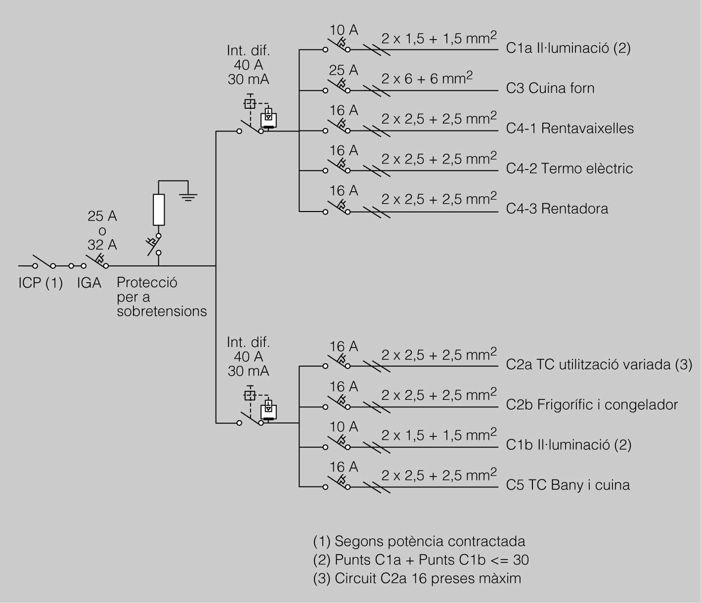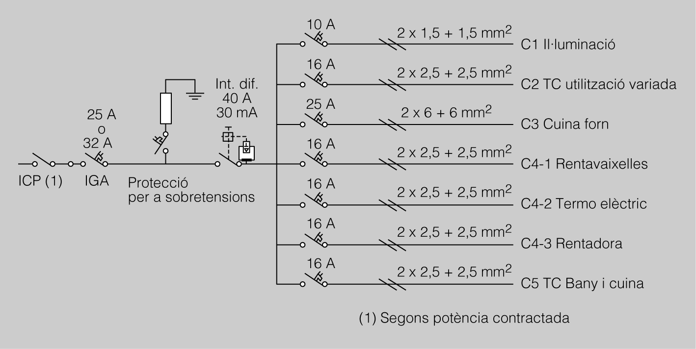 En la figura s’expliquen esquemàticament els circuits d’electrificació bàsica amb els principals circuits que el formen i les característiques dels cables que els componen i la seva utilitat dintre de l’habitatge.
