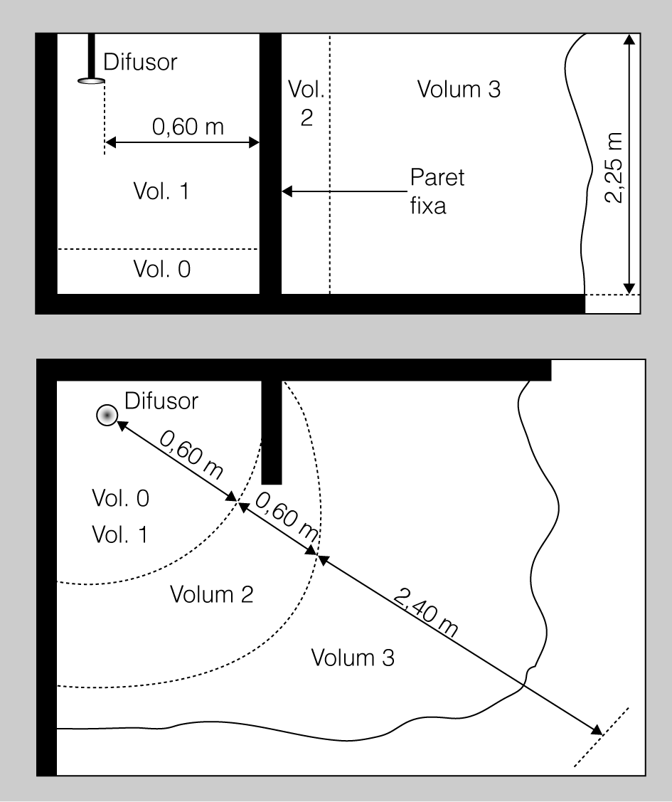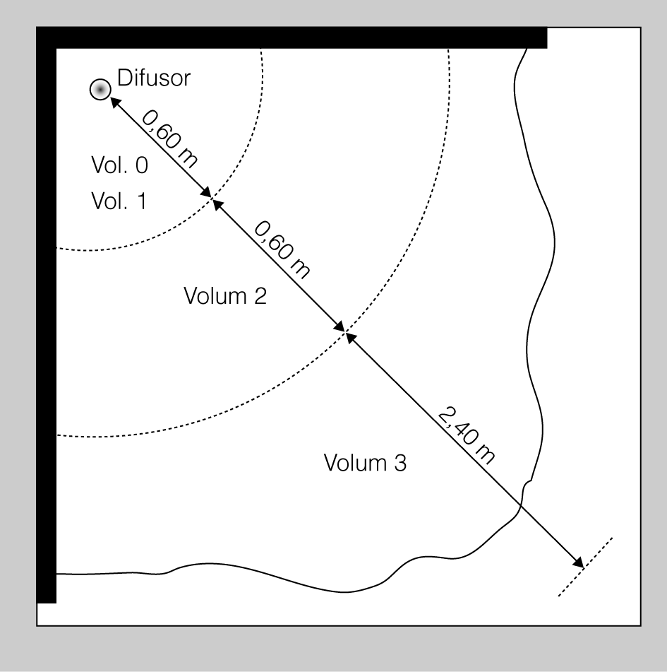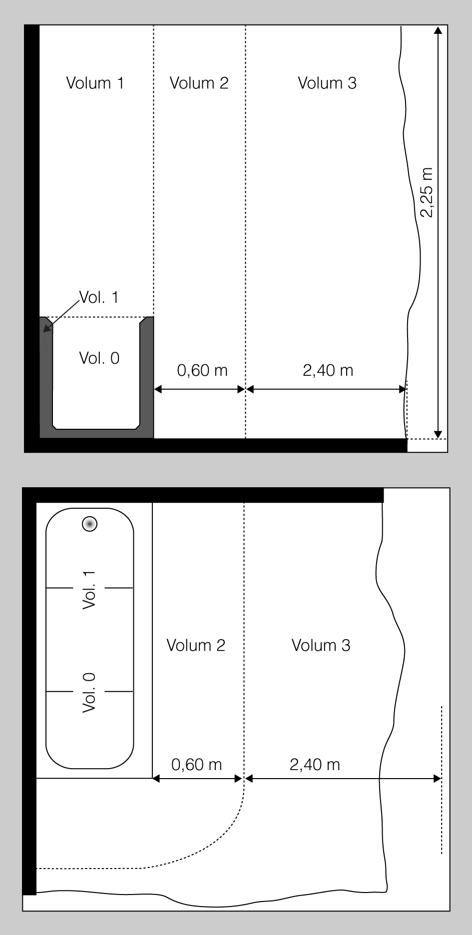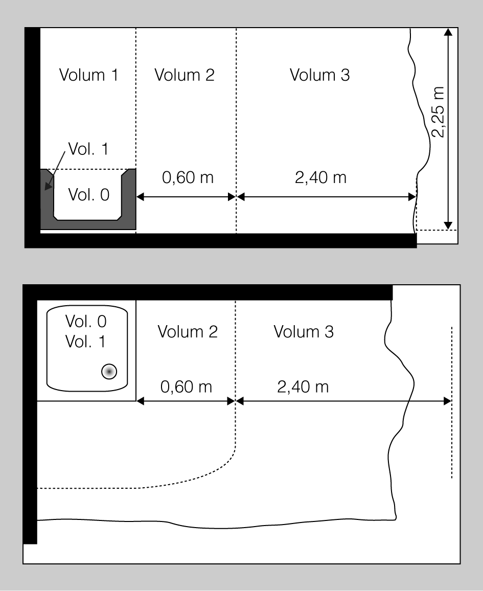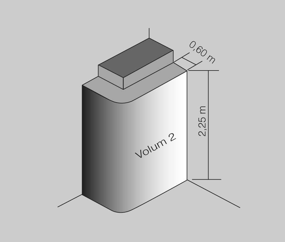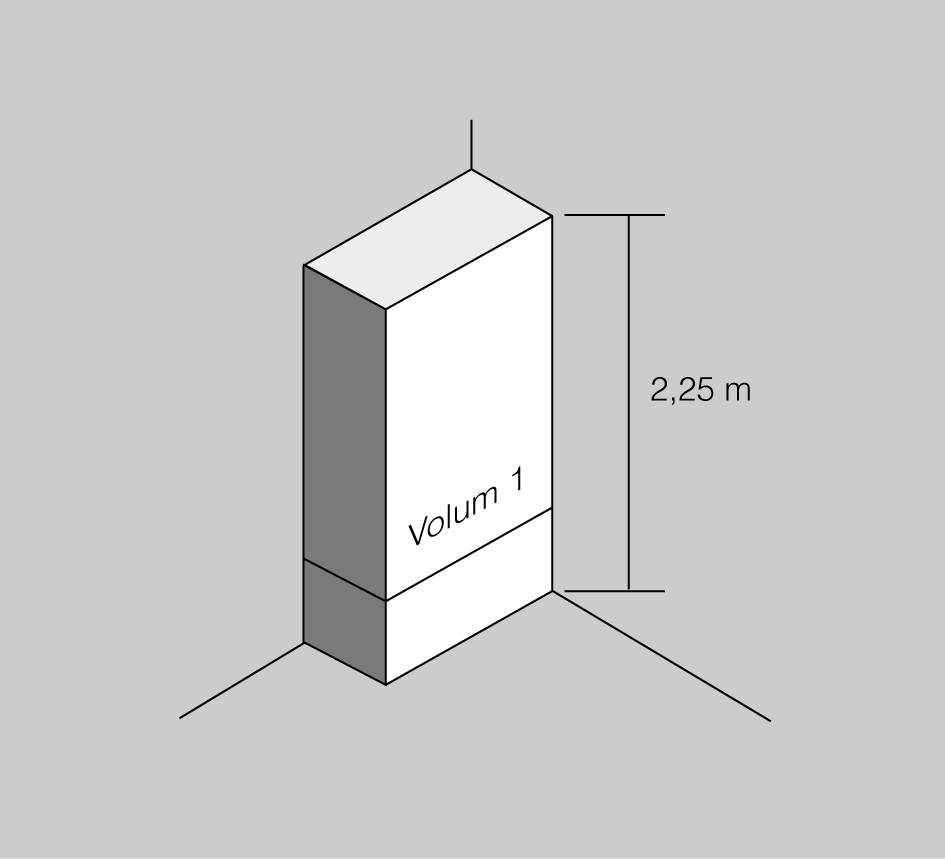 El volum 2 és limitat pel pla vertical exterior al volum 1 i el pla vertical paral·lel situat a una distància de 0,6 m; i el terra i el pla horitzontal situats a 2,25 m per sobre del terra (figura).