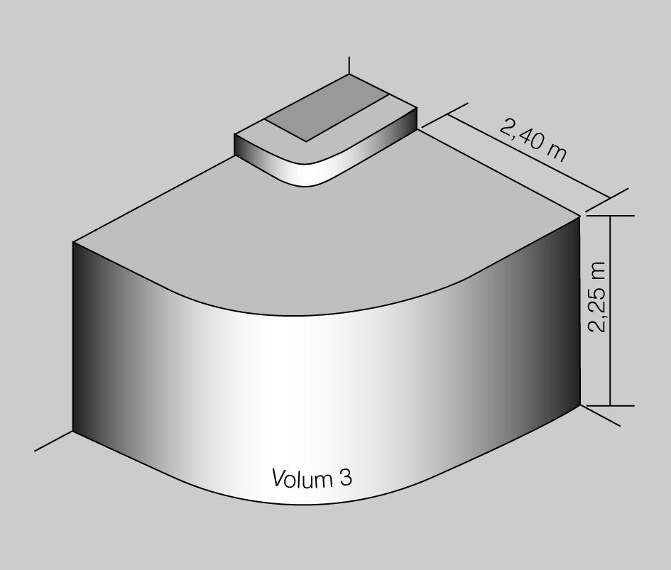 El volum 3 és limitat pel pla vertical límit exterior del volum 2 i el pla vertical paral·lel situat a una distància d’aquest de 2,4 m; i el terra i el pla horitzontal situats a 2,25 m per sobre del terra (figura).