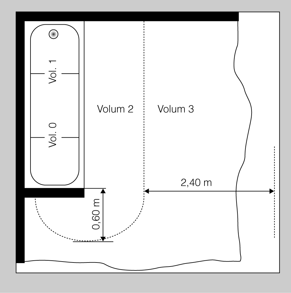 | Volum 2 | IPX4 IPX2, per sobre del nivell més alt d’un difusor fix. IPX5, als banys comuns en els quals es puguin produir dolls d’aigua durant la seva neteja. (1) | Limitat al necessari per alimentar els aparells elèctrics fixos situats en els volums 0, 1 i 2, i la part del volum 3 situada per sota la banyera o dutxa. | No està permesa la seva instal·lació, amb l’excepció d’interruptors o bases de circuits MBTS la font d’alimentació dels quals és instal·lada fora dels volums 0, 1 i 2. Es permeten també la instal·lació de blocs d’alimentació de màquines d’afaitar que compleixin la UNE-EN 60472 o UNE-EN 61558-2-5. | Tots els permesos per al volum 1. Llums, ventiladors, calefactors i unitats mòbils per a banyeres d’hidromassatge que compleixin la seva norma aplicable, si la seva alimentació és protegida addicionalment per un dispositiu de protecció de corrent diferencial de valor no superior als 30 mA, segons la norma UNE 20460-4-41. |