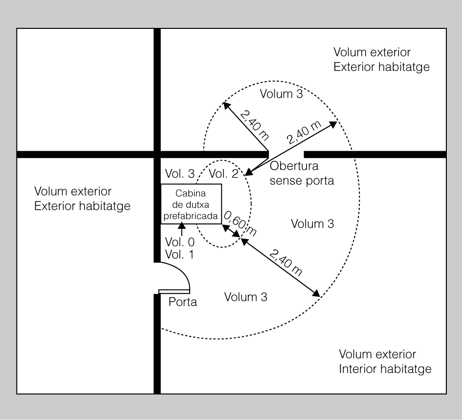 Aquests requisits no s’apliquen al volum 3, a recintes en què hi hagi una cabina de dutxa prefabricada amb els seus sistemes de drenatge, diferents d’un bany, per exemple d’un dormitori.