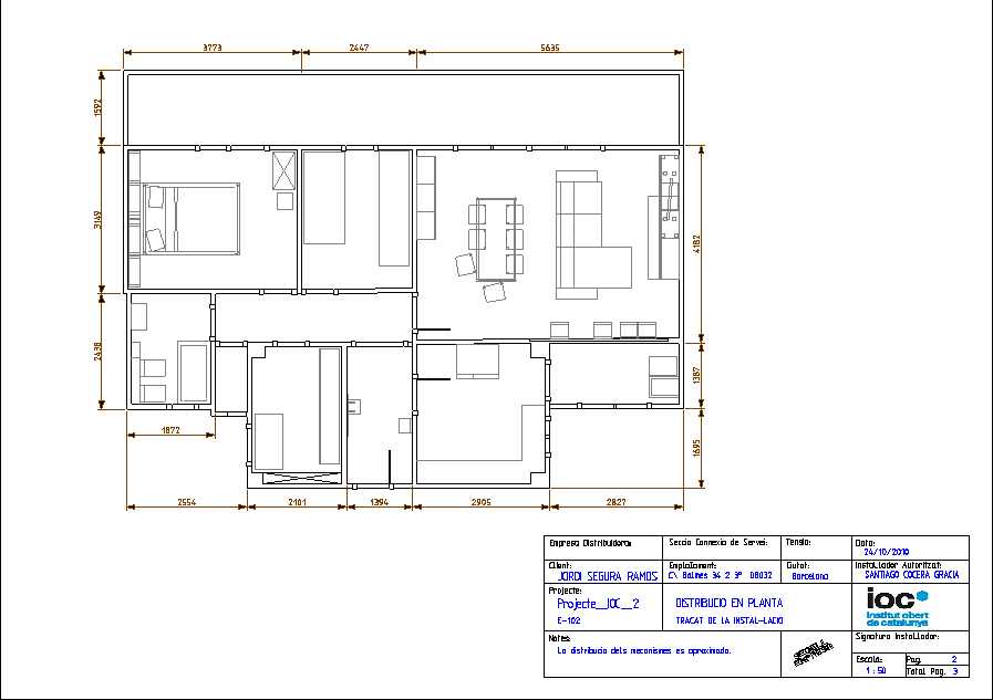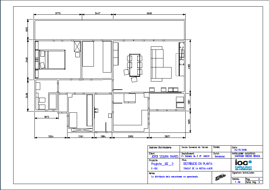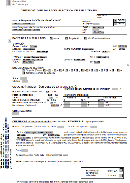 - Empresa instal·ladora: instal·lacions IOC, amb número de registre REIE-123456, situada a l’avinguda del Paral·lel, 71-73, de Barcelona, 93 339 12 34. L’instal·lador autoritzat és Santiago Cocera Gracia, amb NIF 12345678A i carnet individual identificatiu d’instal·lador autoritzat 111111X.