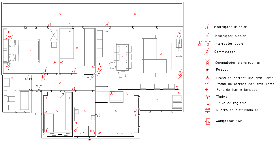 - Rebedor: un punt de llum, un interruptor i una presa de corrent.