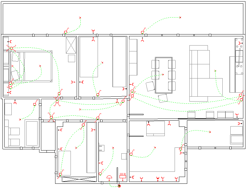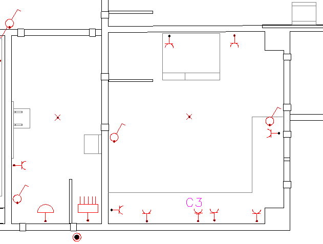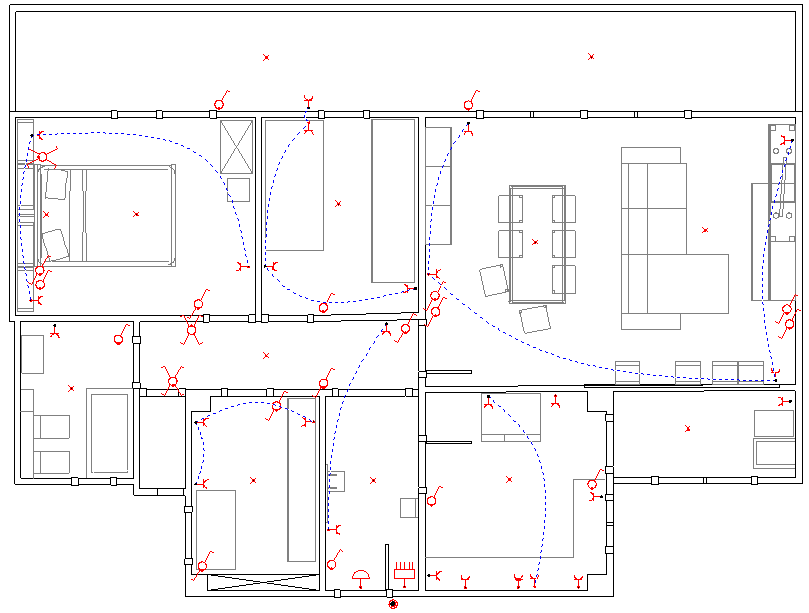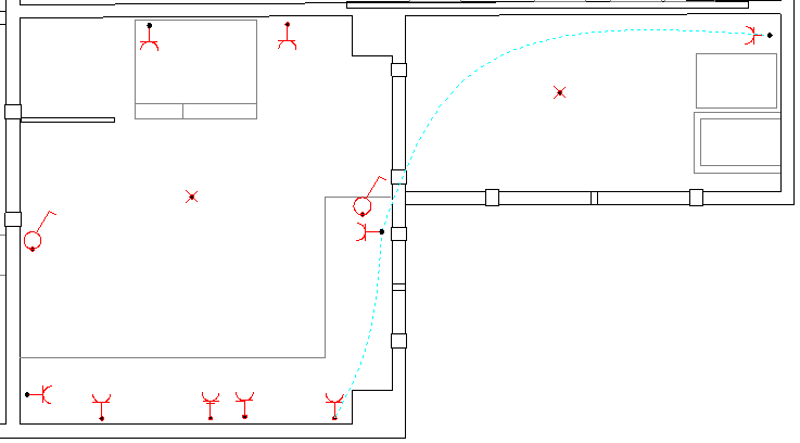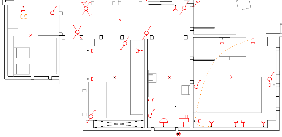 En el dormitori 1 apareixen dos punts de llum i quatre accionadors (figura). S’ha pressupostat que un punt de llum s’encén amb un interruptor i que l’altre punt de llum es pot encendre i apagar indistintament des de tres punts. Per tant, s’ha de pressupostar un interruptor, dos commutadors simples i un commutador d’encreuament.