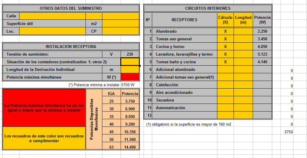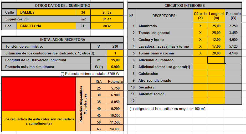 Un cop s’obre el fitxer amb el Calc, s’ha de visualitzar el primer full de càlcul, el de la pestanya Enunciado (vegeu la figura). En aquest full s’han d’emplenar les cel·les que hi ha en color groc. Hi ha una casella en color vermell, és per posar la potència màxima instal·lada. Al mateix full, a la part de sota, en color carn hi ha les potències normalitzades. A la banda dreta, s’ha d’escriure una ‘X’ en els circuits que s’han instal·lat. Per defecte vénen els cinc mínims de tota instal·lació d’electrificació bàsica, i s’ha d’incloure la longitud màxima del circuit. La resta de cel·les del full no s’han de modificar.