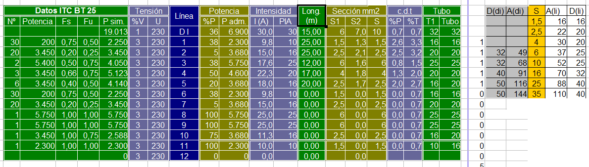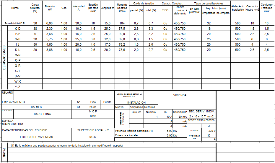 El següent full de càlcul del fitxer correspon els càlculs que s’han de fer per determinar les caigudes de tensió de cada línia i seccions. Aquest full no s’ha d’imprimir ni entregar amb l’MTD, és un full intern de càlculs (vegeu la figura).
