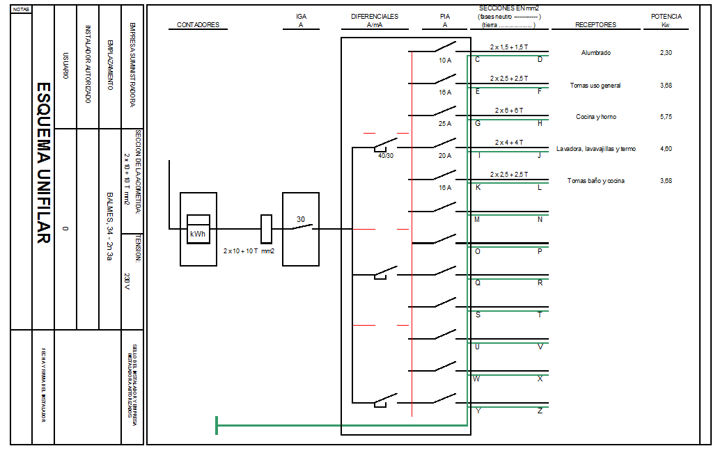 En el tercer full de càlcul del fitxer es pot trobar l’esquema unifilar de la instal·lació, que correspon a l’imprès ELEC-2 (vegeu la figura). Hi apareixen els diferents circuits de l’habitatge, amb els corresponents PIA. També especifica el diferencial, l’IGA i la secció de la derivació individual. De la mateixa forma, incorpora les seccions dels conductors de cada circuit. És molt important revisar totes les dades que hi apareixen per tal que l’esquema coincideixi exactament amb la instal·lació realitzada i amb els requisits del reglament. Per poder veure l’esquema amb més claredat es pot fer una visualització prèvia.