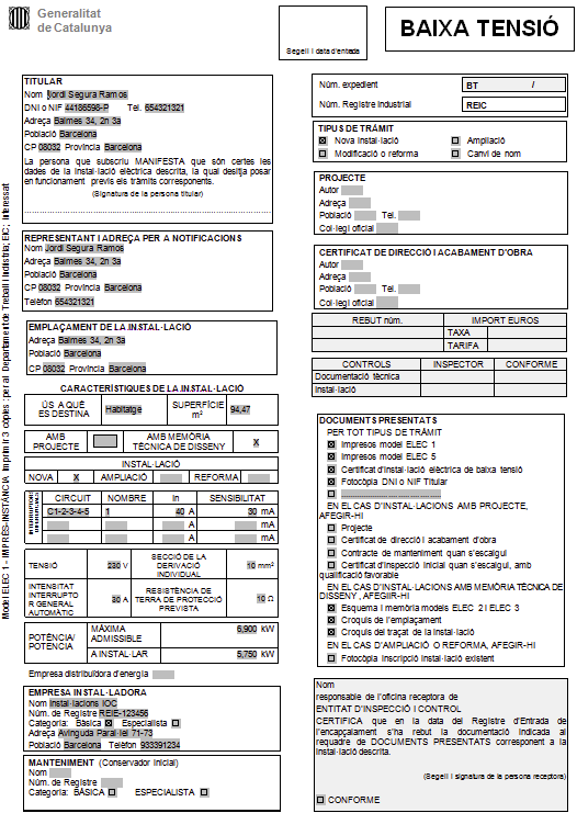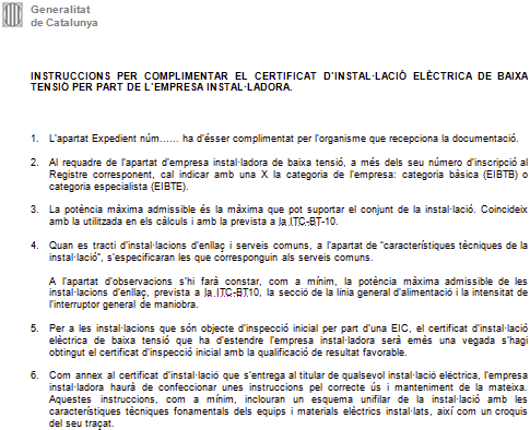 Per poder emplenar aquest imprès i el certificat d’instal·lació elèctrica de baixa tensió, les dades de la instal·lació són les següents: