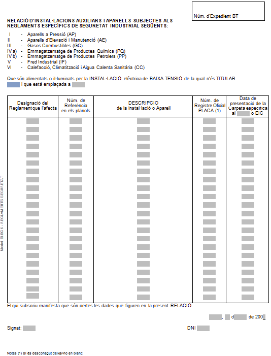 L’imprès ELEC-5 és per detallar els aparells subjectes a reglaments específics de seguretat. En aquest cas no n’hi ha i, per tant, aquest fitxer s’haurà de deixar en blanc (vegeu la figura).