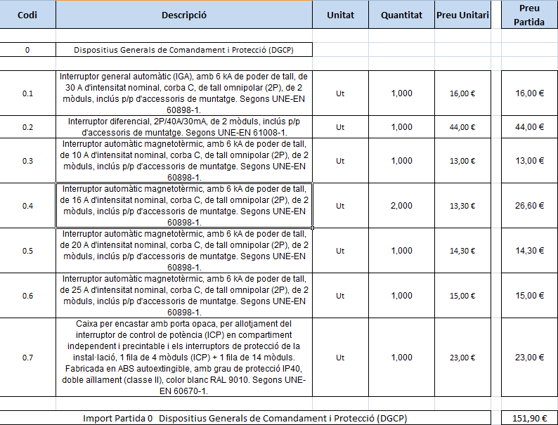 El pressupost del dispositius generals de comandament i protecció (figura) inclou l’IGA, que segons l’MTD és per a 6.900 W, els cinc PIA i l’interruptor diferencial. No s’inclou l’interruptor de control de potència, perquè aquest dispositiu l’instal·la directament la companyia elèctrica i va lligat a la potència per contractar.