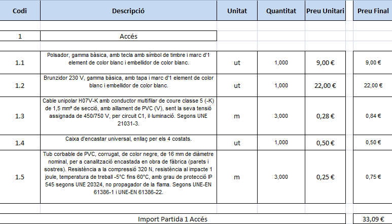 | Accés | C1 | Polsador timbre | 1 | - |