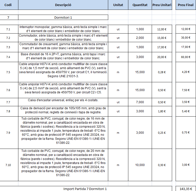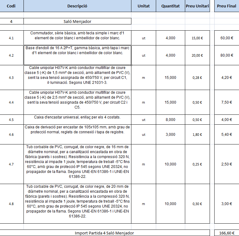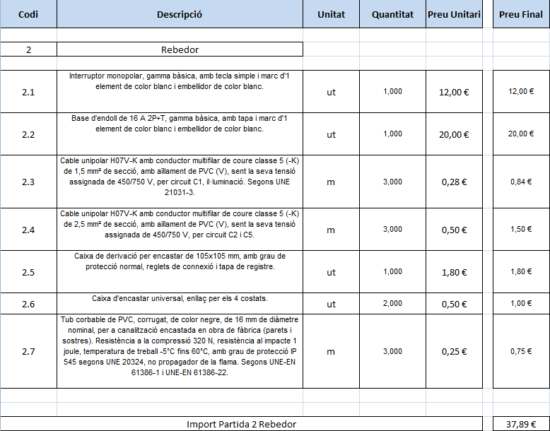 Dins del rebedor (figura) s’inclou el material que s’especifica en la taula del dimensionament. Cal remarcar que no s’inclou el cost del punt de llum, perquè des del punt de vista elèctric l’instal·lador deixa els cables fora i cada propietari ja escull i compra la lluminària que més li convé al seu habitatge.
