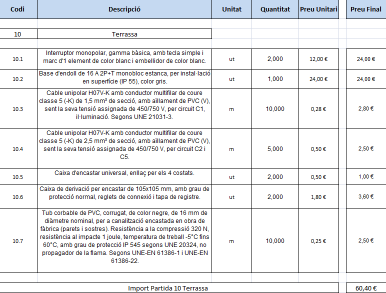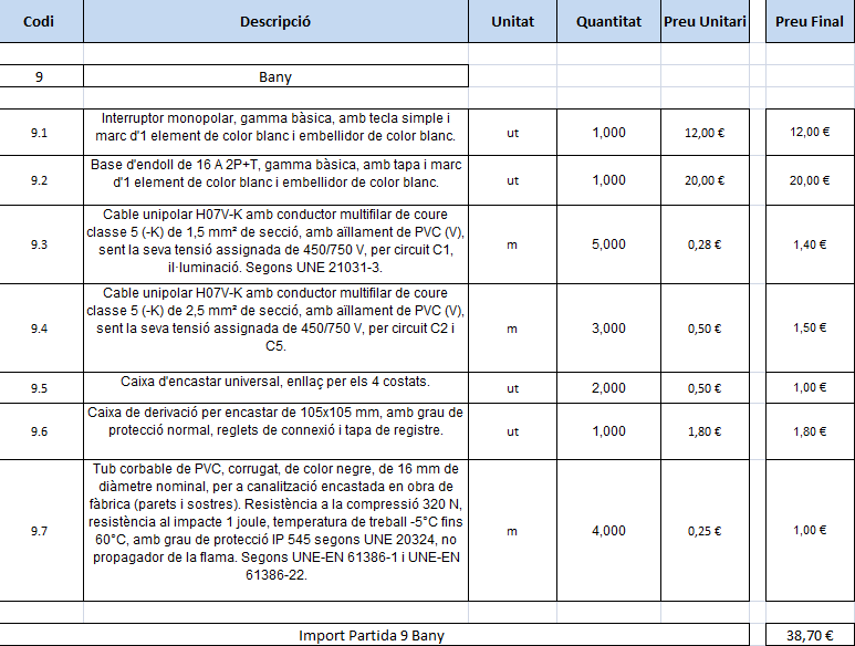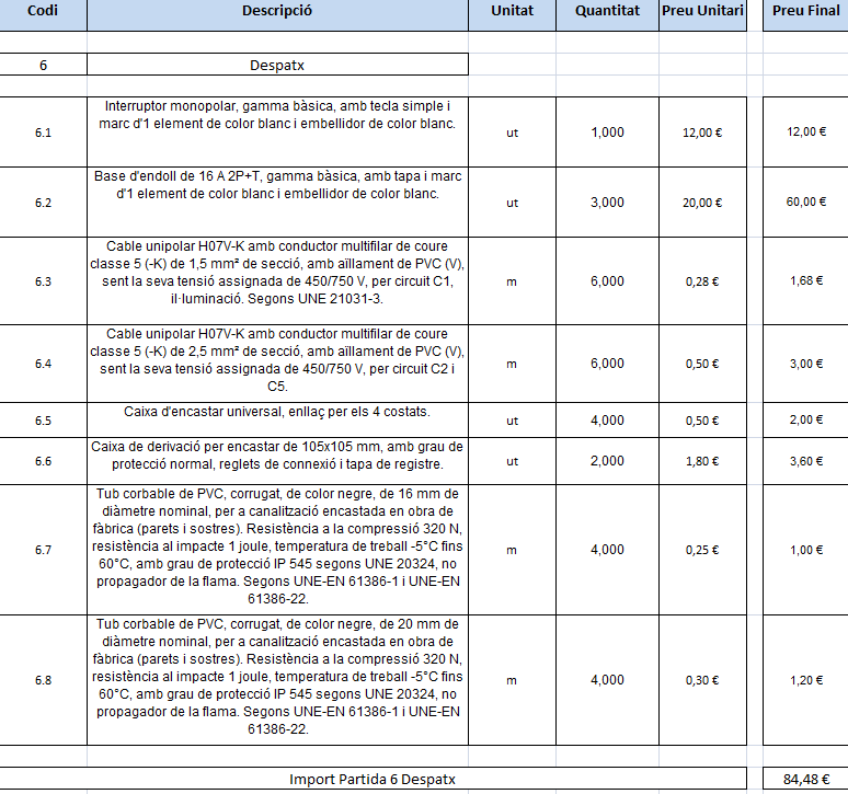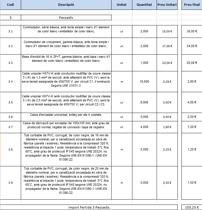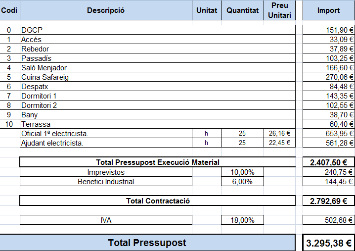 S’ha de fer un càlcul aproximat del temps que es trigarà a fer tota la instal·lació elèctrica. Aquest import rep el nom de pressupost total d’execució material.