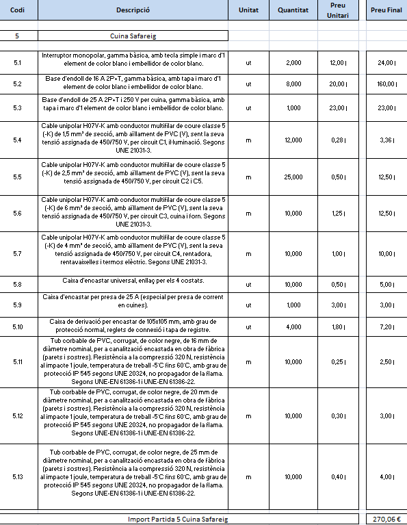 En el pressupost apareixen un total de vuit preses de corrent de 16 A que corresponen a les dues del C2, tres del circuit C4 i tres del C5, ja que tots els endolls són iguals. En el pressupost apareix l’endoll del C3 específic de 25 A, i s’inclou una caixa per encastar específica per a cuines i forn.