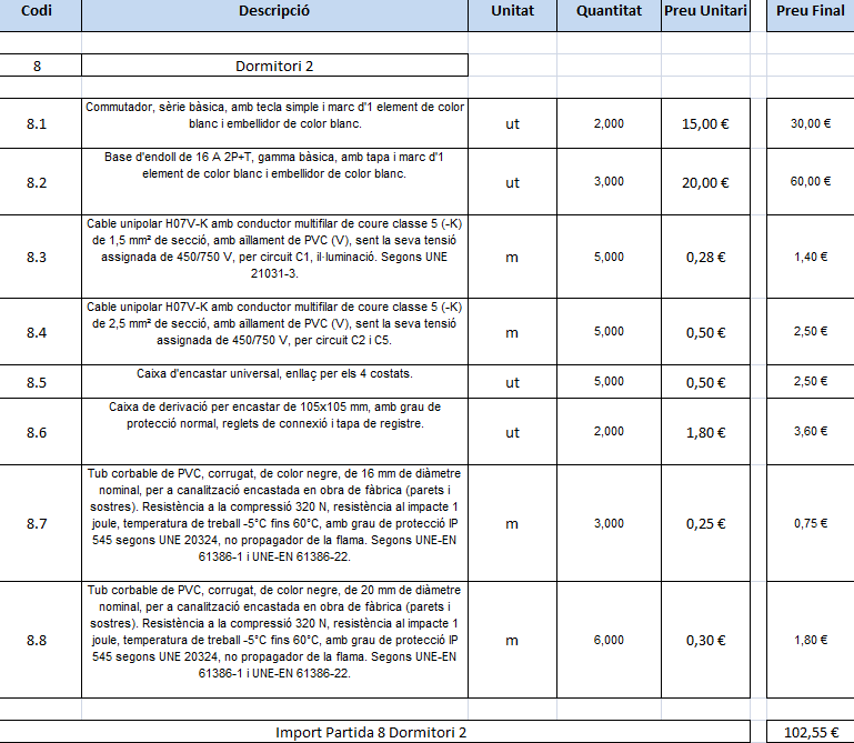 A diferència de les memòries tècniques de disseny, que totes són iguals i vénen marcades pels impresos de la Generalitat de Catalunya, els pressupostos es poden confeccionar de diverses maneres. El model que aquí s’explicarà correspon al més detallat, ja que permet fer el pressupost per estança de l’habitatge, i el més descriptiu, que incorpora la memòria de qualitat dels components instal·lats. D’aquesta manera el client pot veure exactament quin material li serà instal·lat, de quina qualitat i quant costarà cada cosa que s’afegeixi o es retiri del disseny. Si ens basem en els càlculs fets i reflectits a la taula del dimensionament, es pot elaborar un full de càlcul com el que s’ha mostrat per a cada estança.