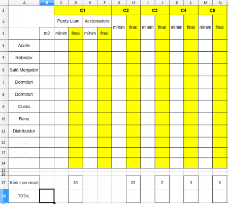 Un cop es té clara l’estructura del full de càlcul, s’ha d’emplenar amb les diferents estances de l’habitatge. En aquest cas tenim: