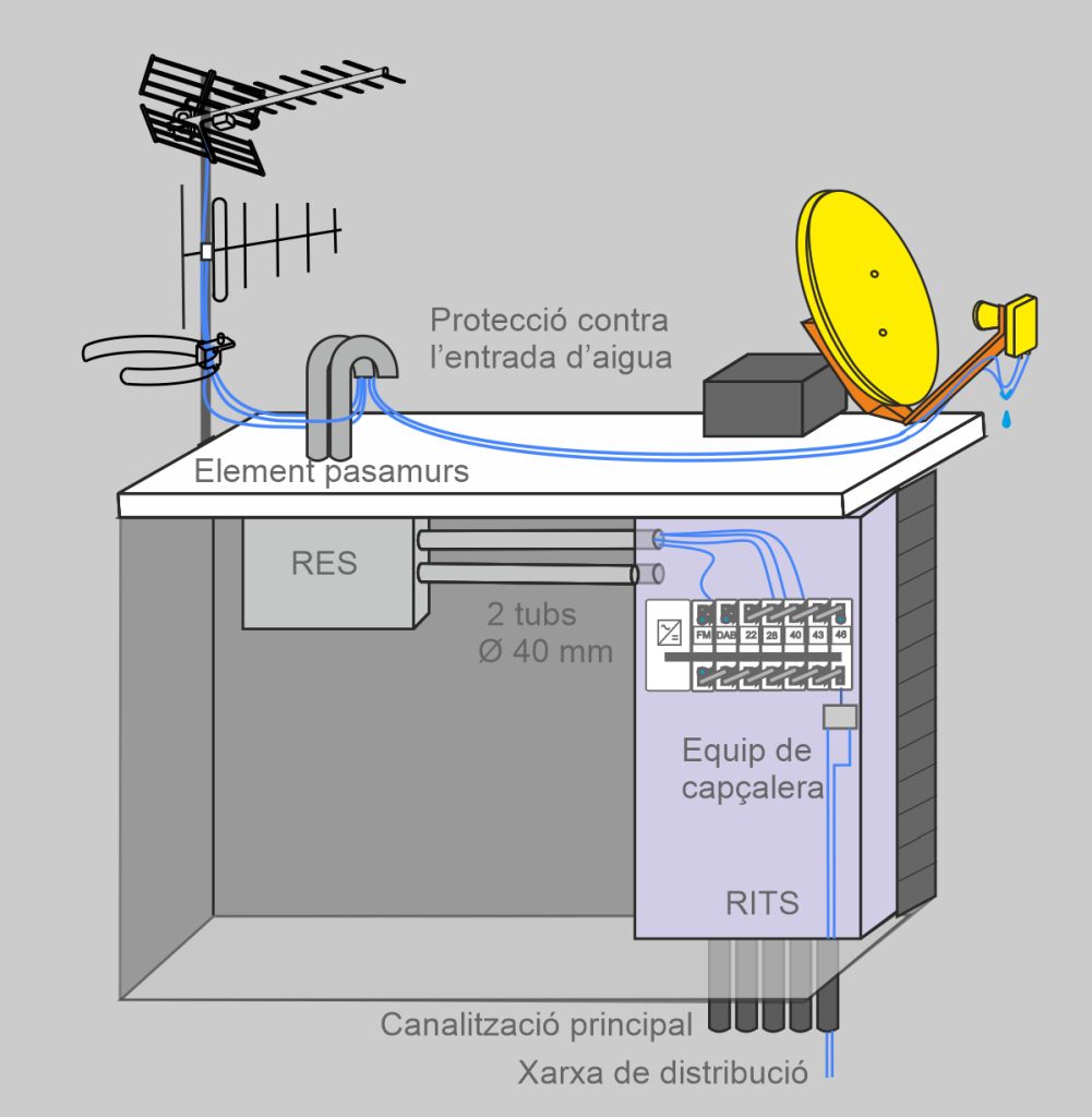 Els cables de baixada de les antenes s’han d’introduir a la ICT de l’edificació a través del corresponent element passamurs i del registre d’enllaç superior (RES). Aquests cables discorren per la canalització d’enllaç superior (CES) fins al recinte d’instal·lacions de telecomunicació superior (RITS), on han d’anar instal·lats els equips que formen l’equip de capçalera i d’on, a través de la canalització principal de la ICT, surten els cables de la xarxa de distribució de TV.