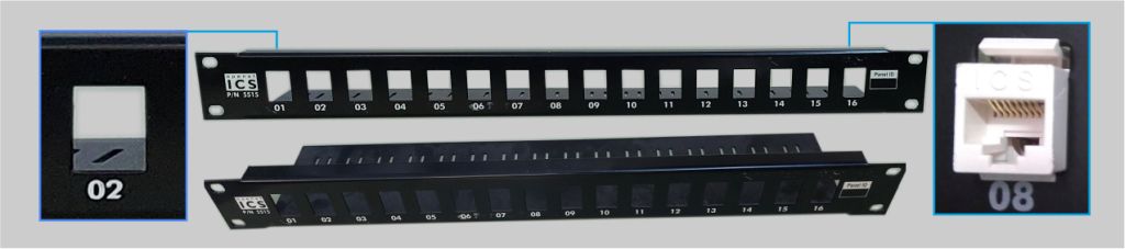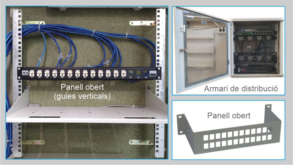 - Panell de connexió buit (figura): aquest tipus de panell no incorpora cap connector i es col·loquen a mesura que s’instal·la cada cable.