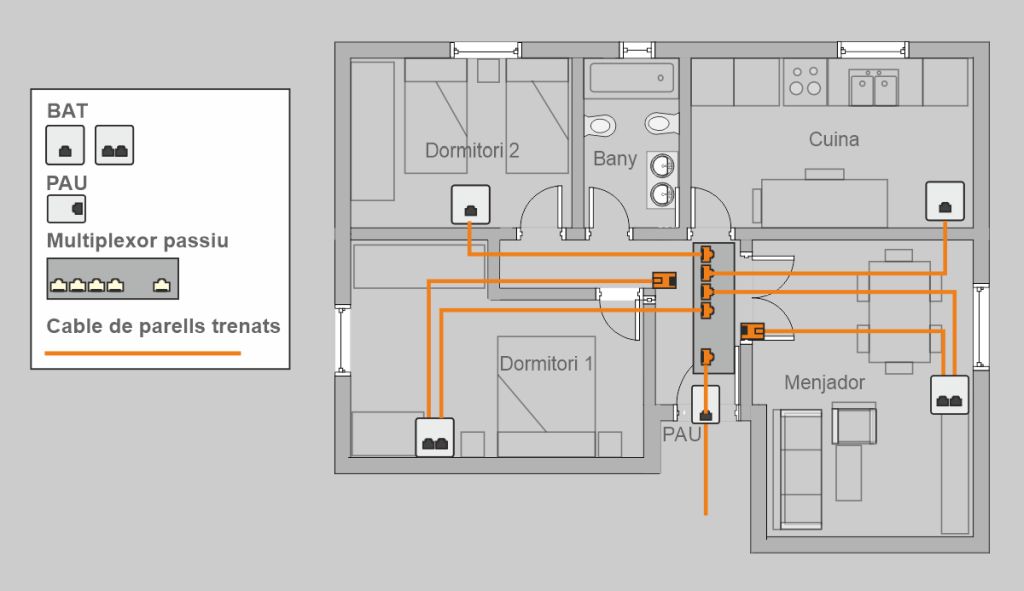 Si hi ha operadors de servei en el lloc de construcció d’un edifici, la xarxa de cables de parells trenats s’instal·la en aquells edificis on la distància entre el punt d’interconnexió i el punt d’accés a l’usuari (PAU) més allunyat sigui inferior a 100 m. En cas contrari, s’instal·la una xarxa de cable de parells.