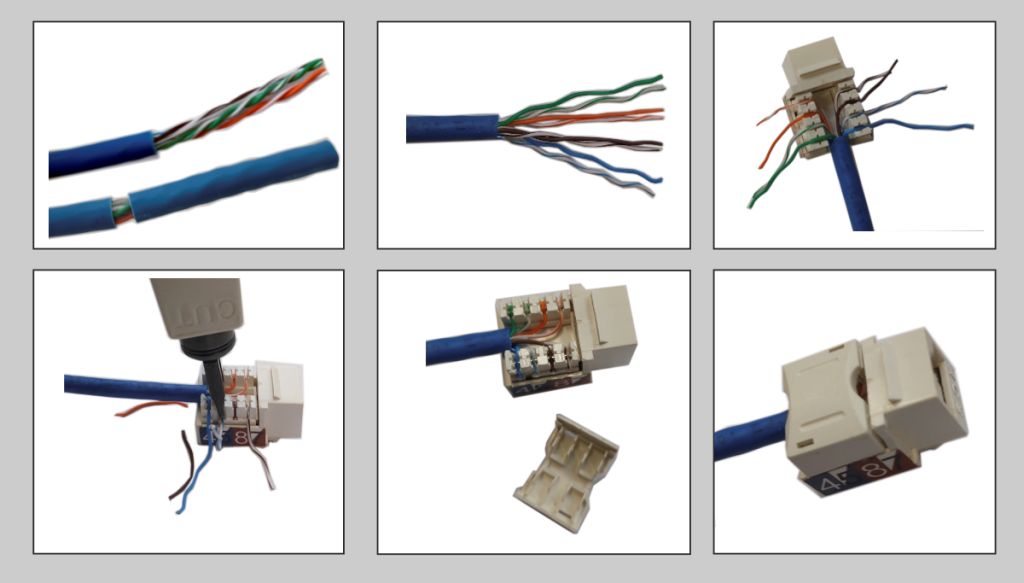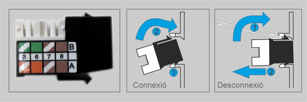 Molts connectors RJ-45 femella utilitzen una connexió anomenada keystone, la qual facilita el muntatge amb la presa d’usuari o el panell de connexions mitjançant un sistema d’encaixament que no requereix l’ajuda de cap eina. En la figura podeu veure el procés de connexió i desconnexió d’aquest sistema.