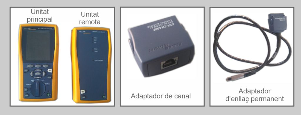 La figura mostra la disposició dels equips de mesura durant la certificació de la xarxa interior d’usuari de cable de parells trenats, on s’han de certificar tots els enllaços permanents de la xarxa interior.