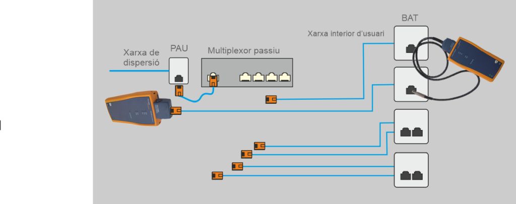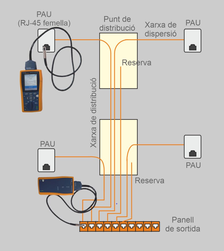 La figura mostra la disposició dels equips de mesura durant la certificació de la xarxa de cable de parells trenats on s’han de certificar tots els enllaços de la xarxa de distribució. Els parells de reserva, com que no estan connectats, no s’han de certificar, ja que el resultat de la certificació dependrà de la correcta instal·lació al PAU quan sigui utilitzat.