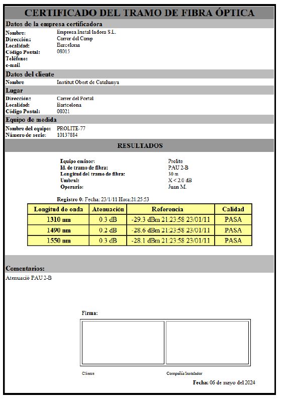 La figura mostra un exemple d’informe de la certificació d’un enllaç de la xarxa.
