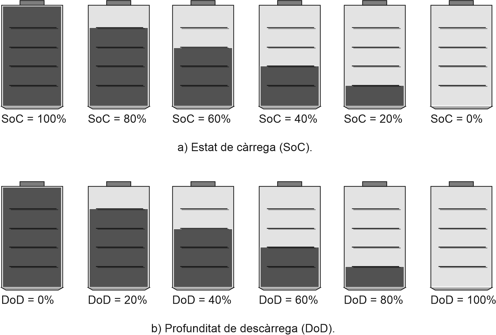 Durant el funcionament d’una bateria hi ha dos conceptes semblants que ens permeten identificar el nivell de càrrega d’una bateria (vegeu la figura):