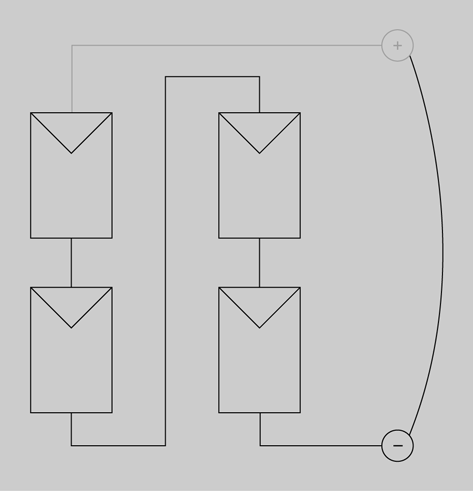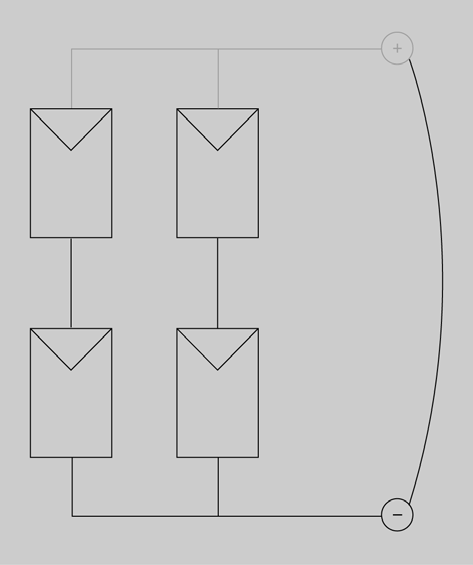 La figura mostra la connexió mixta de quatre plaques fotovoltaiques formada per dues branques de dues plaques en sèrie.
