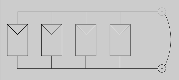 Consisteix a connectar, d’una banda, els terminals positius de tots els mòduls i, de l’altra, tots els terminals negatius. La sortida del conjunt serà entre el terminal positiu i el negatiu de qualsevol mòdul.
