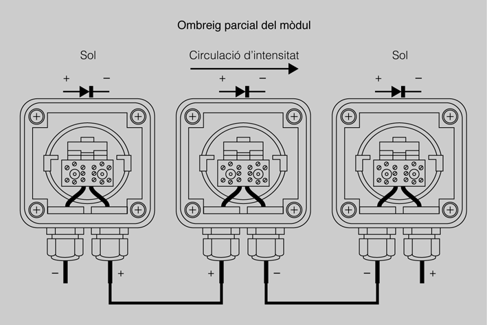 Les caixes de connexions dels mòduls disposen d’un díode (bypass), connectat en antiparal·lel entre els seus borns. Aquest díode dóna un pas alternatiu al corrent generat pels mòduls connectats en sèrie en cas de fallada d’aquest, ja sigui per avaria o perquè li toca l’ombra.