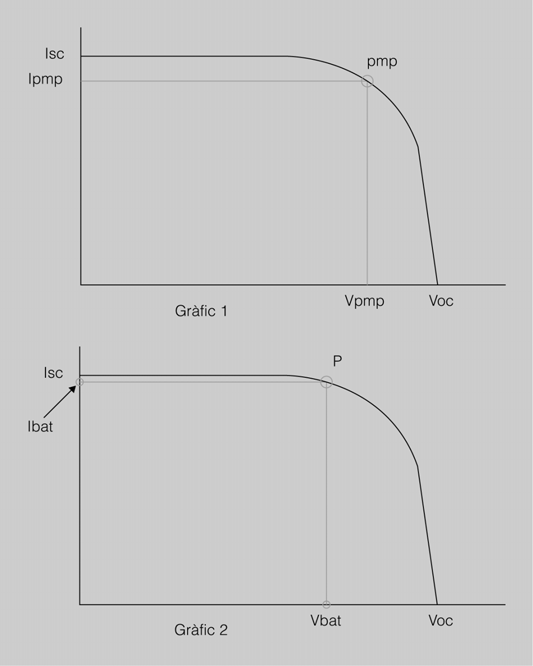 - D’una banda, es perd una petita part de l’energia màxima teòrica, que pot donar la placa (10%), que s’obtindria si treballés a tensions una mica més altes que les que imposa la bateria.