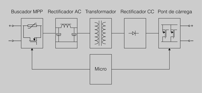 - Regular el punt de treball del generador fotovoltaic (tensió i corrent) per a seguir el punt de màxima potència, que varia en funció de les condicions de radiació i temperatura.