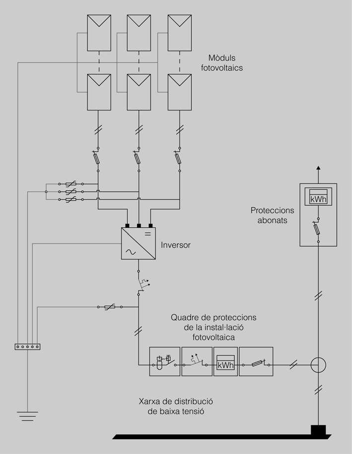 Les instal·lacions solars fotovoltaiques connectades a la xarxa de distribució disposaran dels elements bàsics que es mostren en la figura.