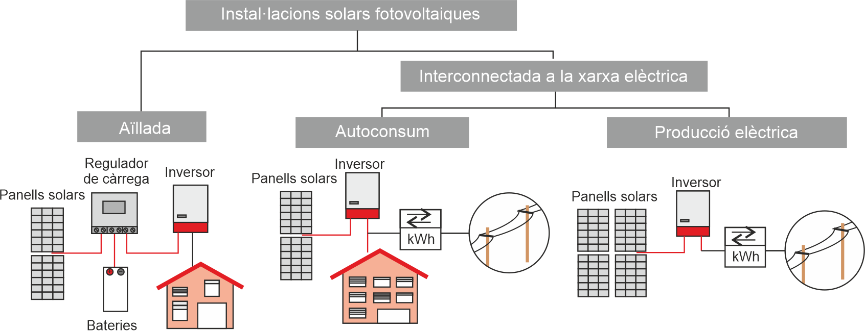 La figura mostra les diferents tipologies d’instal·lacions solars fotovoltaiques: