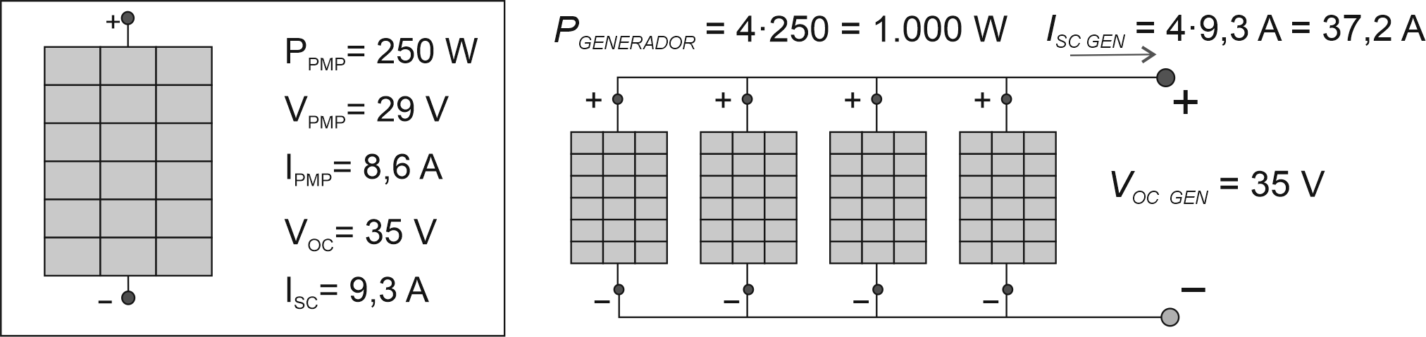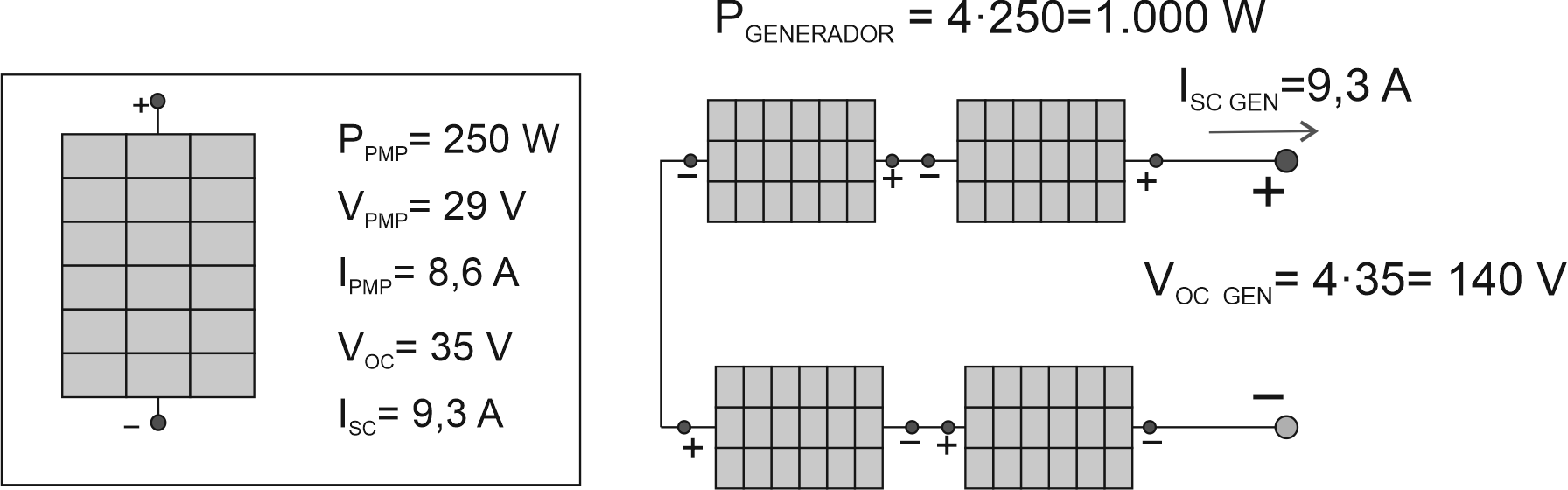 La figura mostra la connexió sèrie de 4 plaques fotovoltaiques. La potència del generador (PGEN) és independent del tipus de connexió. Com que el generador està format per 4 plaques (N), la potencia que resulta és de 1.000 W: