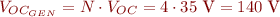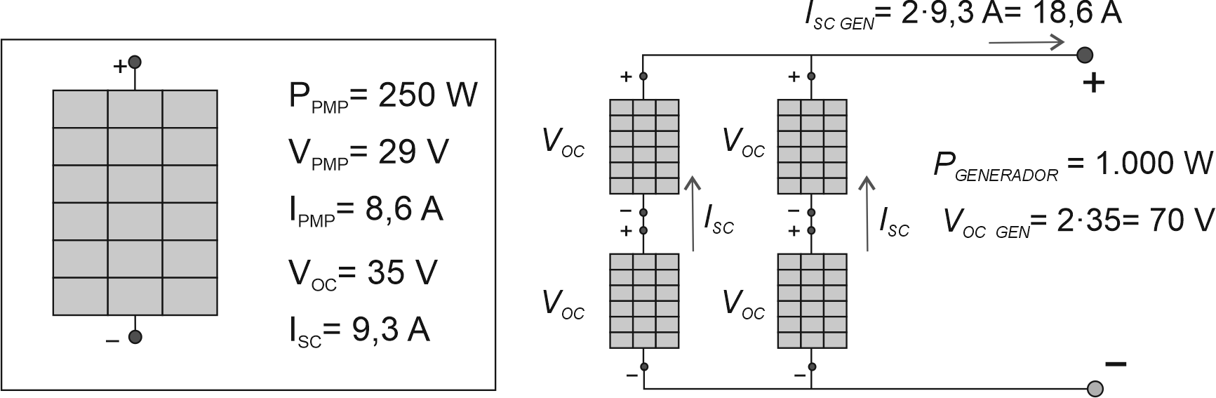 A l’estar connectades en sèrie, la tensió del generador serà la suma de les tensions de cada panell. Com que tots els panels són iguals i hi ha quatre (N) connectats en sèrie, la tensió de circuit obert del generador (VOC GENERADOR ) és: