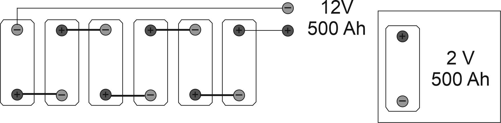 En l’exemple de la figura s’associen 6 bateries de 2 V en sèrie per aconseguir els 12 V nominals d’una instal·lació. La capacitat total no varia (500 Ah).