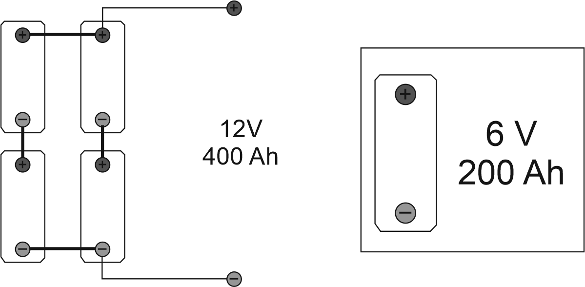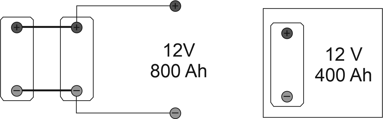En l’exemple de la figura s’utilitzen bateries compactes de 12 V de capacitat 400 Ah, però la capacitat que necessitem en una instal·lació és de 800 Ah. Com que no trobem en el mercat bateries d’aquesta capacitat s’opta per connectar dues bateries en paral·lel: