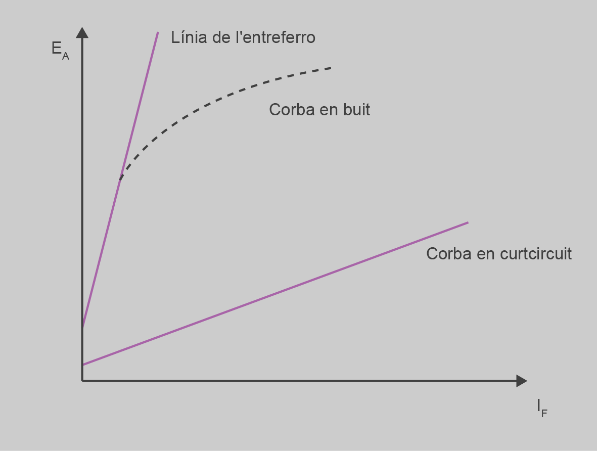 L’alternador es posa a velocitat nominal, els borns de sortida oberts (sense càrrega) i el corrent de camp (If) a 0. En tenir els terminals oberts el corrent d’induït és: