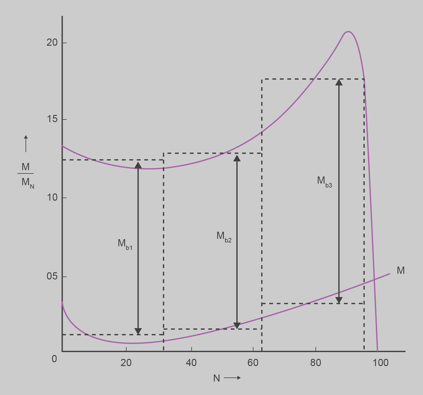 La simplificació que implica prendre un parell constant d’acceleració pot no ser admissible, a causa de la forta inflexió de la corba del parell motor M respecte a la velocitat n. En la figura es pot veure el parell accelerador d’un motor i una càrrega amb parell resistent quadràtic. Per fer el càlcul de temps d’arrencada més simplificat, la superfície entre les corbes característiques de parell motor i parell resistent es desglossa en tres parts iguals, que van de 0 a n1, de n1 a n2 i de n2 a n3; de manera convenient, per a n3 es tria el 95% de la velocitat plena. En cada cas, aquestes parts se substitueixen per rectangles d’igual superfície amb altures Mb1, Mb2 i Mb3, que donaran lloc a tres temps d’arrencada diferents per a cada cas, com a la figura.