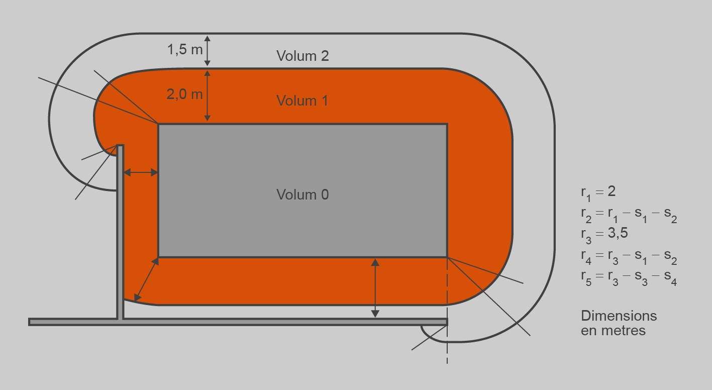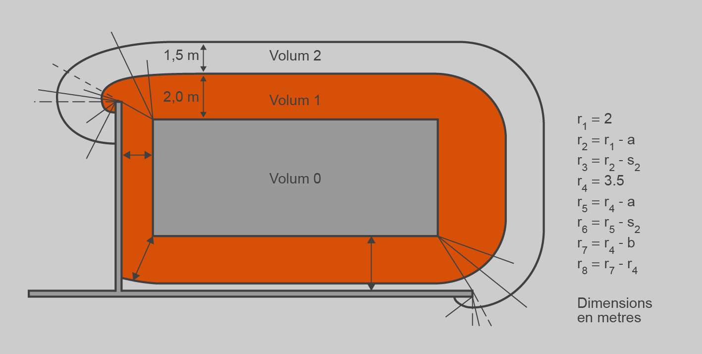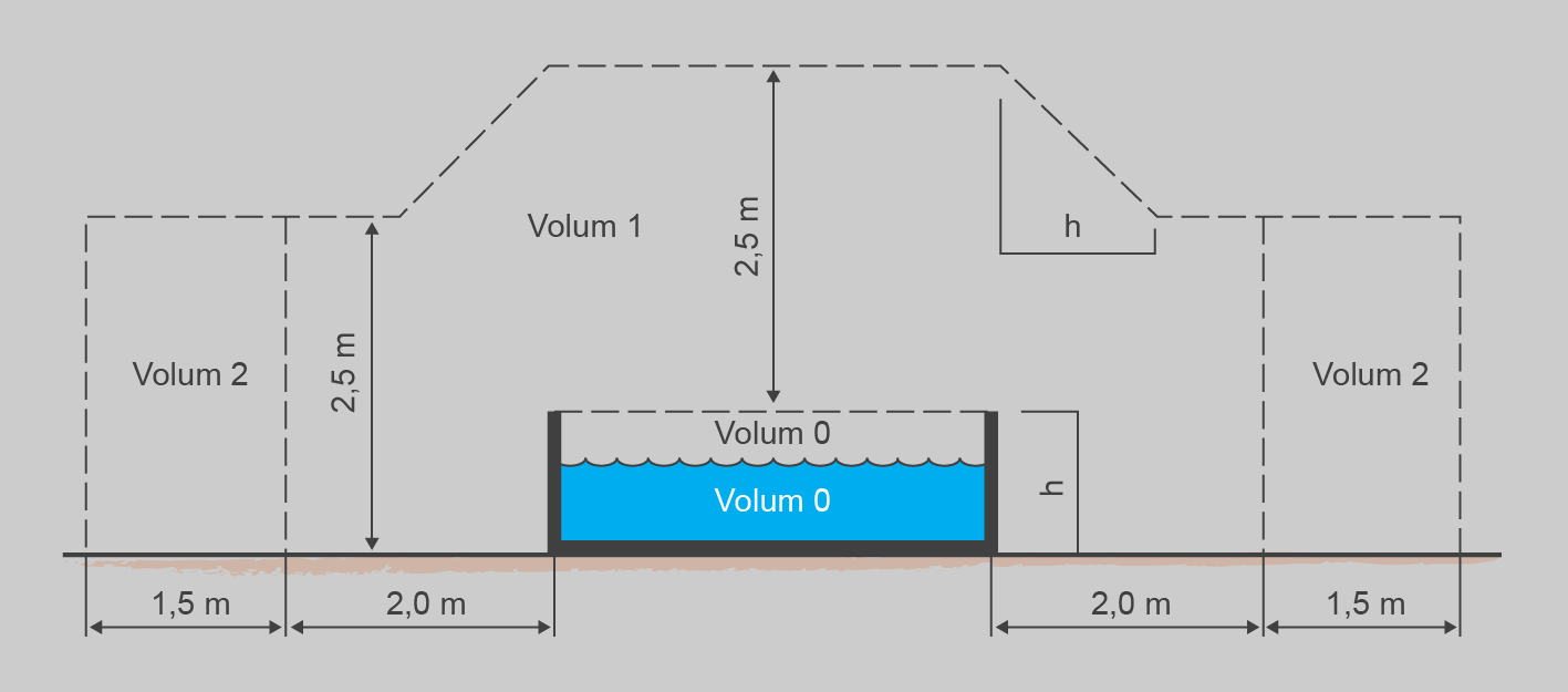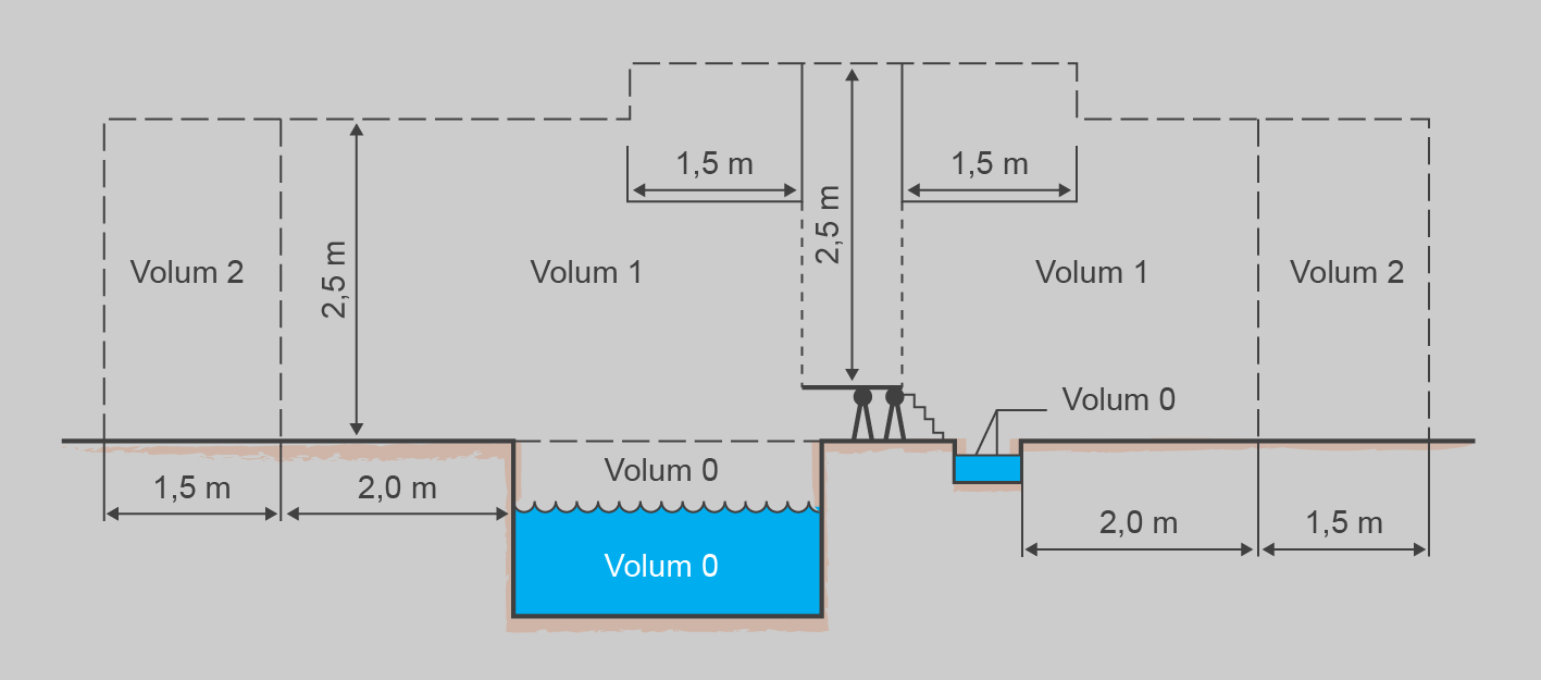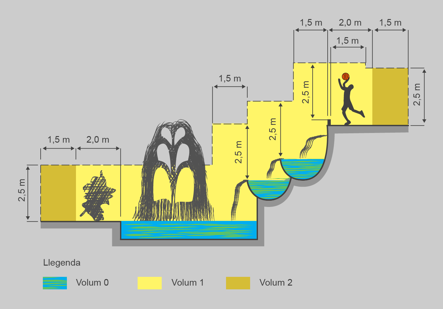 El volum 1 de les piscines i els banys de peus és l’espai format per la intersecció d’un pla vertical situat a 2 m des de la vora de l’interior del recipient, és a dir, el volum 0, i un pla horitzontal situat a 2,5 m d’altura per sobre del terra i la superfície del recipient.