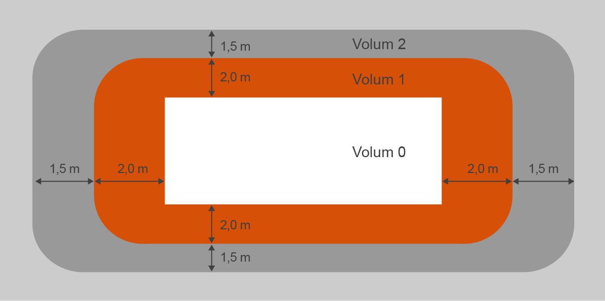 El grau de risc elèctric és màxim en el volum 0 i va decreixent en els casos dels volums 1 i 2. No s’ha de considerar en cap cas un volum 3.