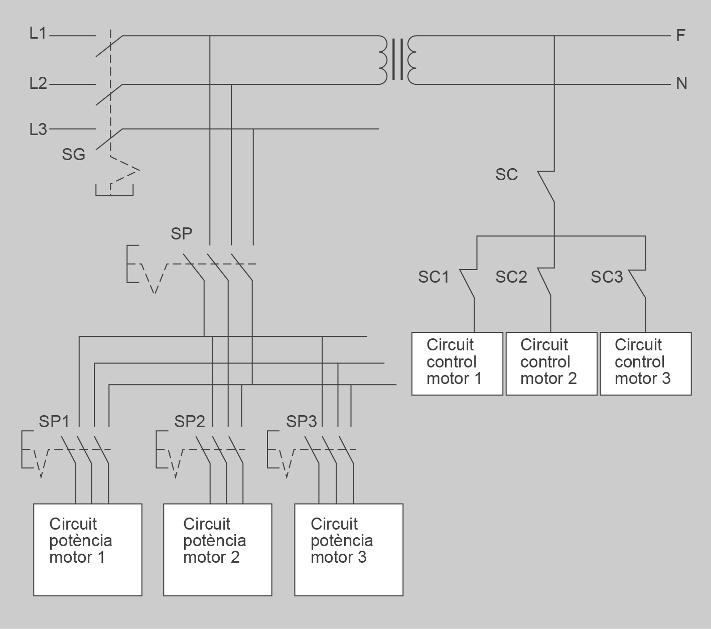 L’esquema mostra que les alimentacions poden ser interrompudes des de diferents nivells, començant per un tall complet de l’alimentació amb SG, seguint per la capacitat de desconnectar únicament els circuits de potència, SP, i de control, SC, per separat o finalment poder deixar sense alimentació únicament el circuit de només un motor dels tres amb SC1, SC2 i SC3 o SP1, SP2 i SP3. Aquest exemple pot servir de model pràctic de les prescripcions en matèria de tall de l’alimentació que dicta el Reglament.