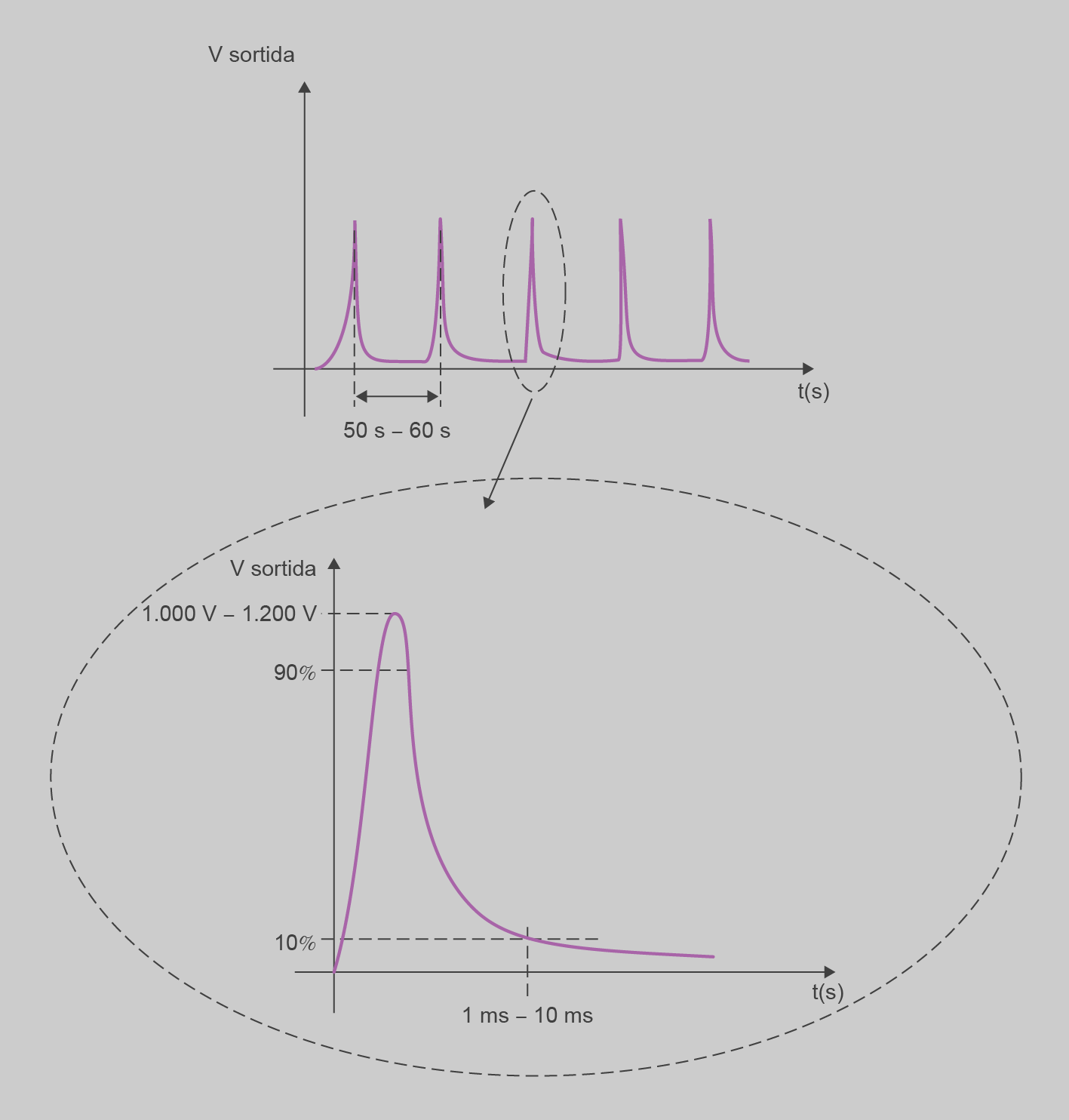 La figura mostra la gràfica temporal de la tensió injectada per l’alimentador a la tanca per a la seva electrificació. Hi ha la seqüència temporal i l’ampliació en detall de cada pols de tensió.