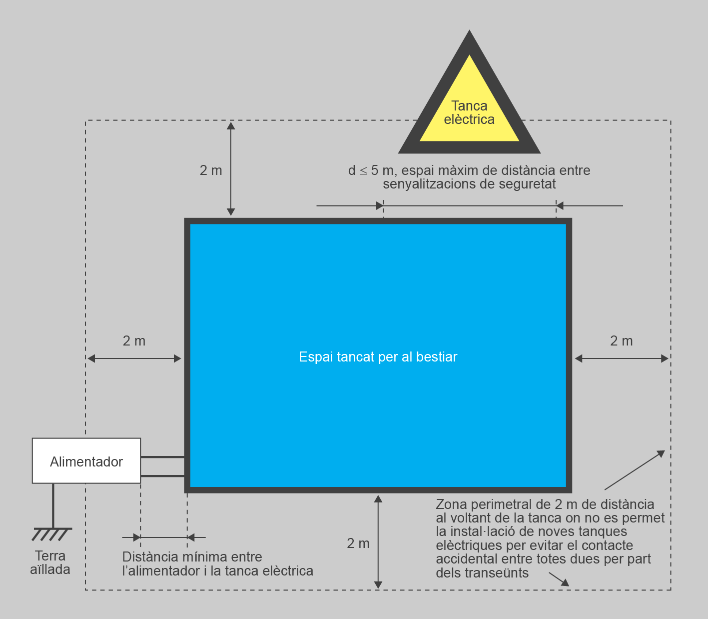 Cal respectar una distància mínima de 2 m entre el perímetre de la tanca i qualsevol altra element en tensió que estigui alimentat per una font diferent, com per exemple un altre tancat electrificat, per evitar d’aquesta manera que es puguin tocar totes dues instal·lacions simultàniament.