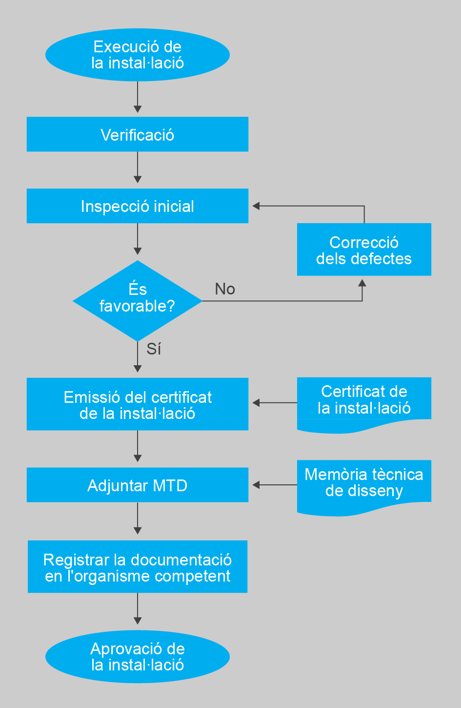 Finalment, cal registrar el certificat d’instal·lació davant de l’òrgan competent de la comunitat autònoma, en el cas de Catalunya el Departament d’Empresa i Ocupació de la Generalitat, juntament amb un annex en el qual s’hi inclou informació d’interès per a l’usuari i la documentació tècnica corresponent.
