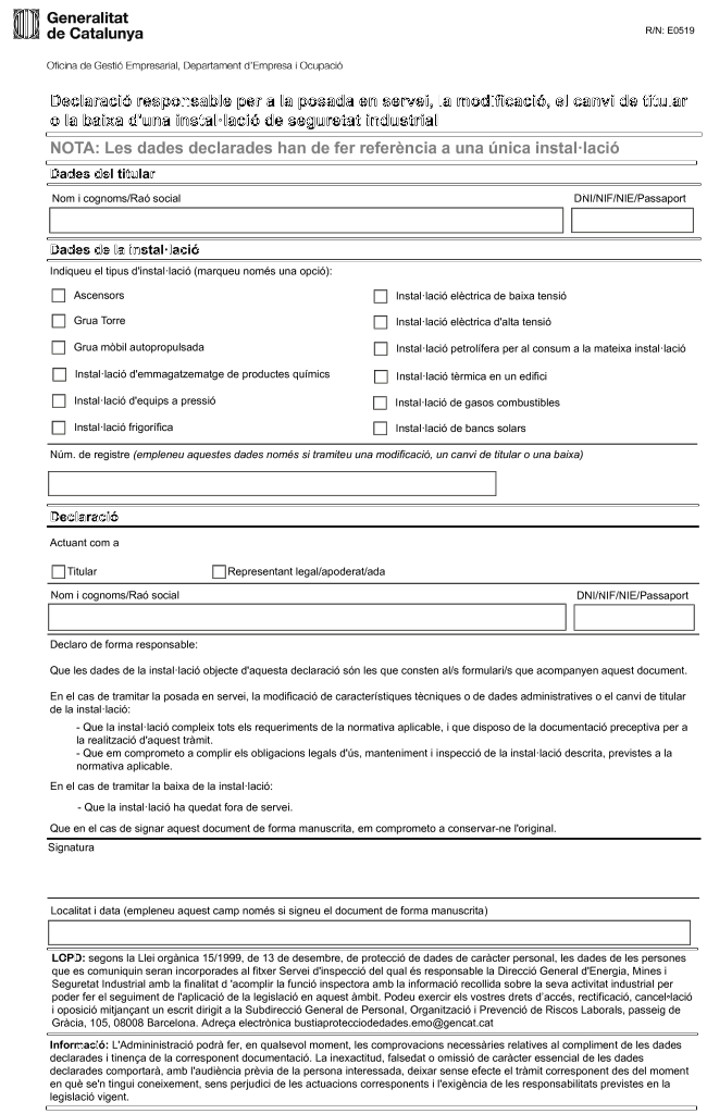 - Declaració responsable per a la posada en servei, la modificació, el canvi de titular o la baixa d’una instal·lació de seguretat industrial