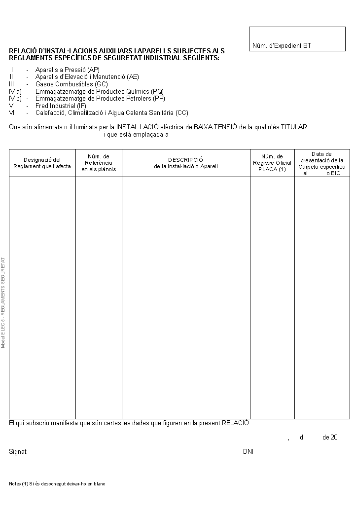 El model ELEC5 consisteix en una relació d’instal·lacions auxiliars i aparells subjectes als reglaments específics de seguretat industrial que són alimentats per la instal·lació elèctrica de baixa tensió, la posada en servei de la qual voleu tramitar. Es tracta d’un document de compliment obligat tant en el cas d’una memòria tècnica de disseny com en el cas d’un projecte.